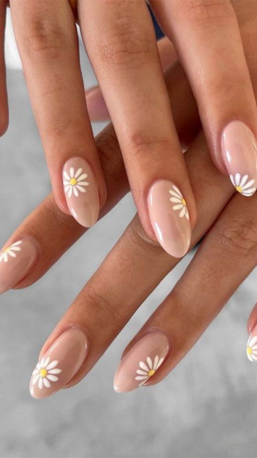 11. Daisy nail art on a sheer base