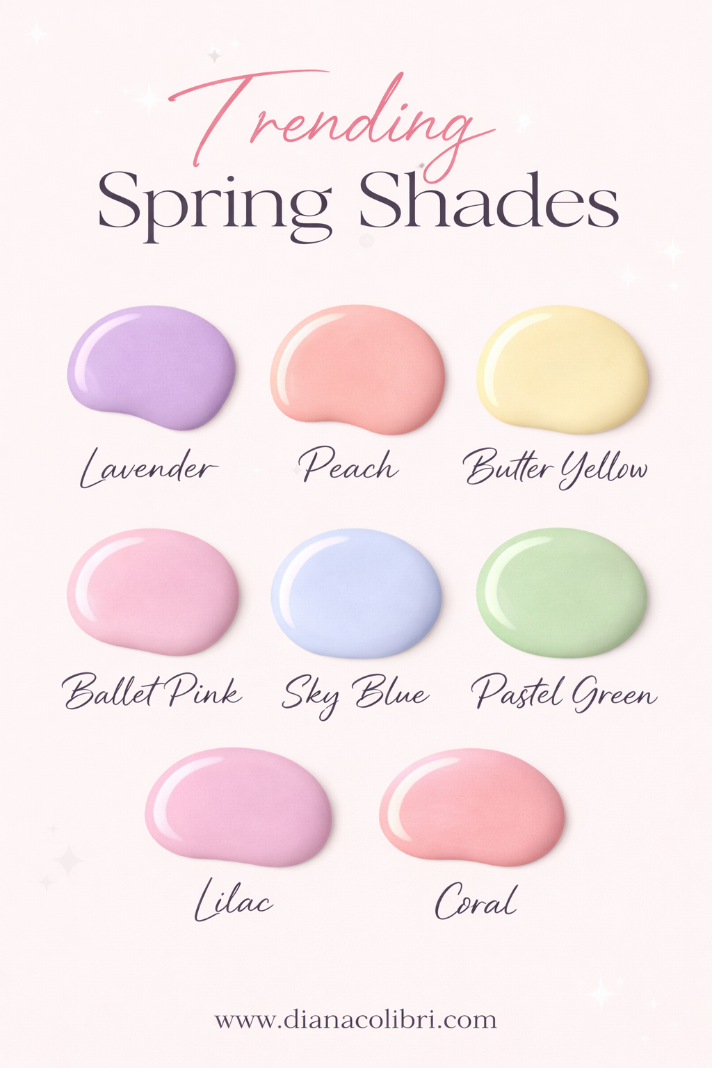 Milky pink, lavender, butter yellow, baby blue, and pistachio green are among the popular spring nail colors this year.