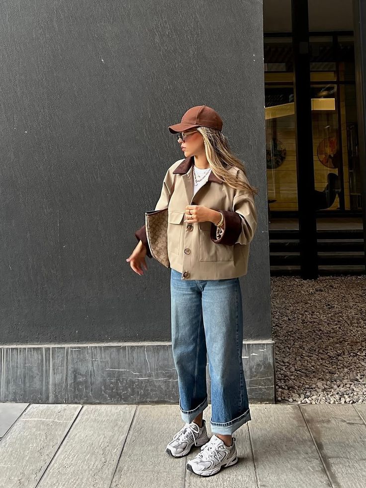 A barn jacket + wide-leg pants = understated cool. Add a baseball cap and chunky sneakers to make the look feel modern and urban.