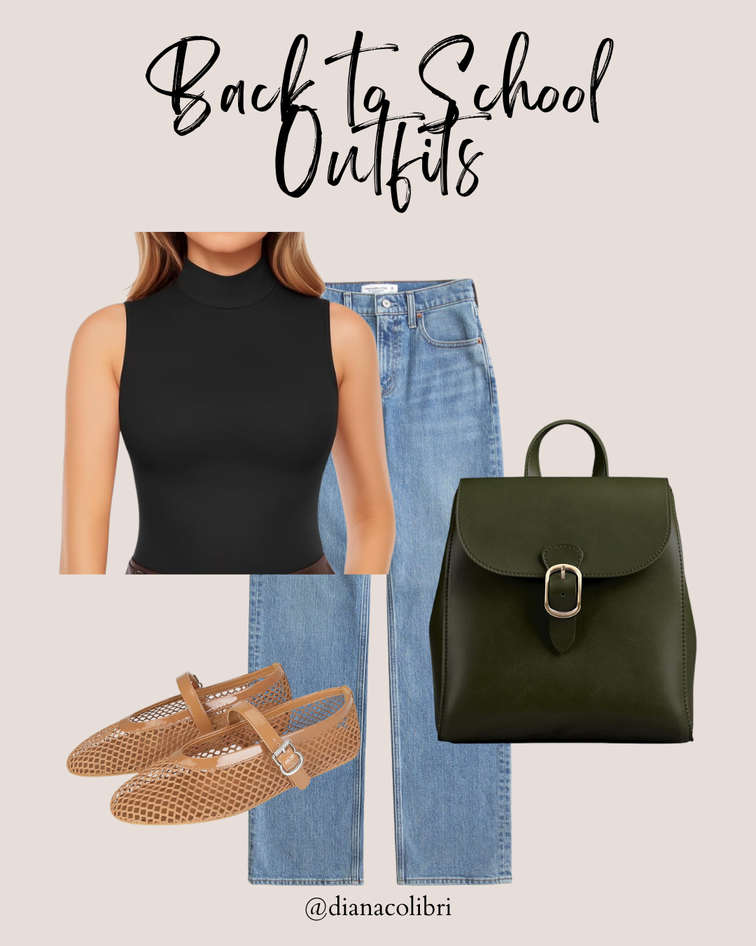 9. Mock Neck Bodysuit + Straight-Leg Jeans + Belted Backpack