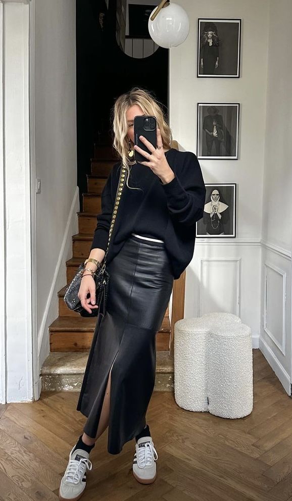 Faux leather tops, skirts, and dresses are everywhere in fall outfits this year.