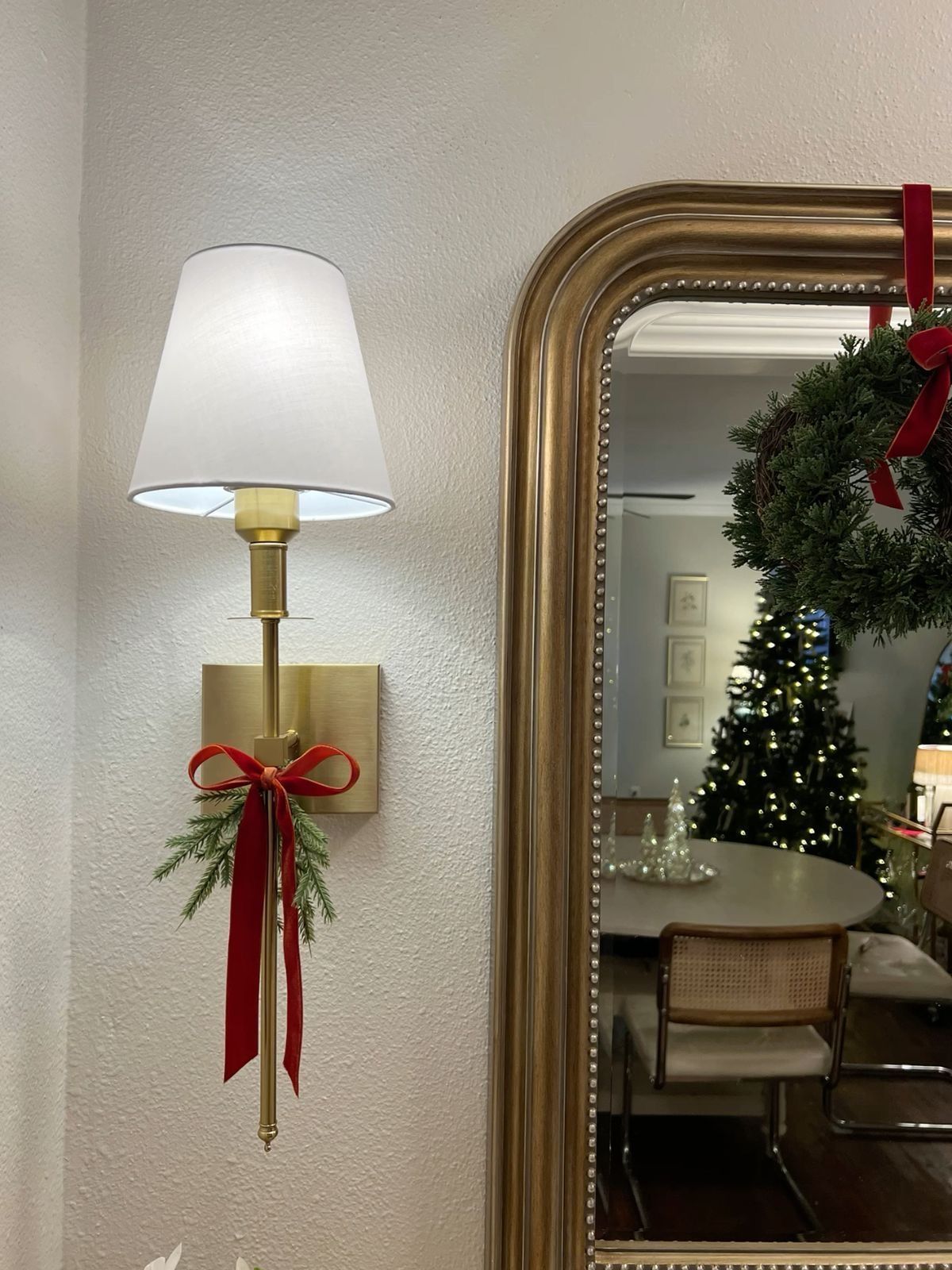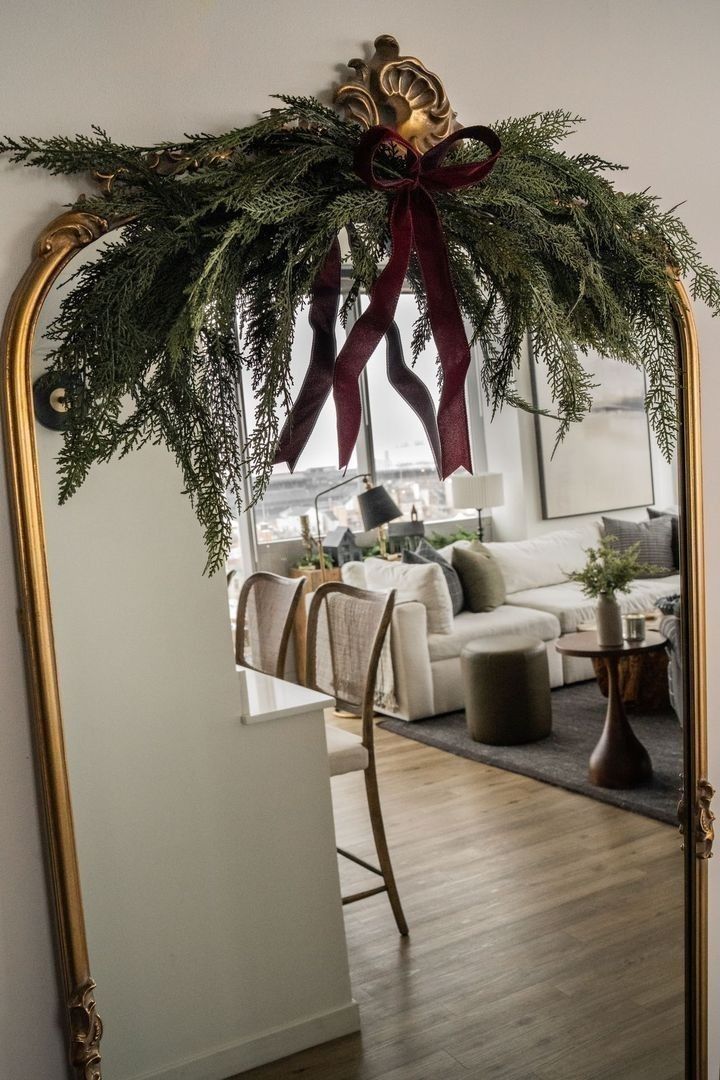 Greenery is essential, but not the overly staged faux kind. Think loose cedar garlands, magnolia branches, long sprigs of pine tucked into a vase, or fresh wreaths with a minimal velvet ribbon. This is where the style softens and feels alive.