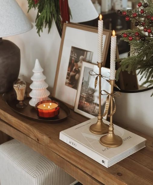 Brass candlesticks, glass hurricanes, lantern-style lights, and warm white strings create the atmosphere you’re looking for. It gives your home that moody, editorial glow that feels equal parts nostalgic and refined.