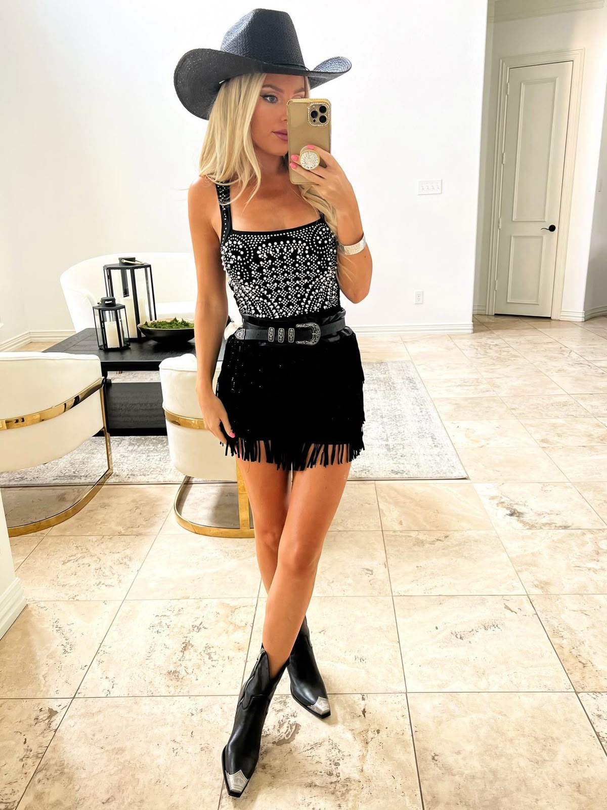The fringe, black denim, statement boots, and just enough sparkle to make you feel like the main character at a honky tonk.